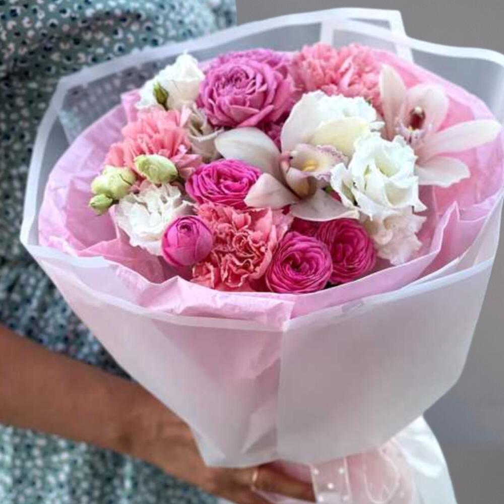 Нежный букет из ароматной эустомы , пионовидной розы , диантусов и орхидей